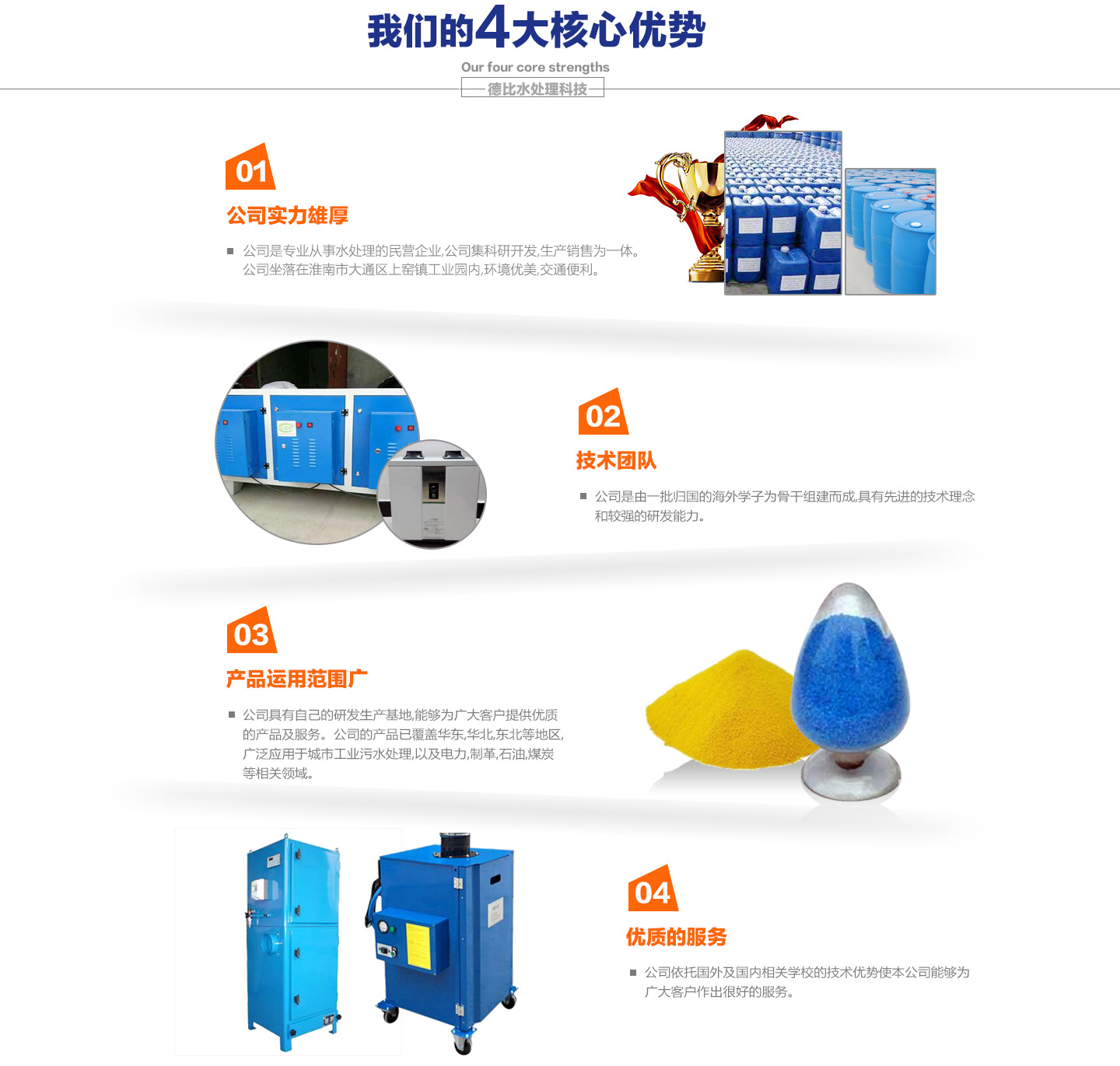 <p>淮南德比水處理科技有限公司是專業從事水處理的民營企業,公司集科研開發,生產銷售為一體。公司坐落在淮南市大通區上窯鎮工業園,環境優美。公司占地面積16畝,固定投資3000萬元,完全建成后年產可達2萬噸固體鐵系及鋁系工業水處理藥劑,成為華東地區大的固體水處理藥劑生產廠家。 本公司是由一批歸國的海外學子為骨干組建而成,具有先進的技術理念和較強的研發能力。公司依托國外及國內相關學校的技術優勢使本公司能夠為廣大客戶作出很好的服務。本公司具有自己的研發生產基地,能夠為廣大客戶提供產品及服務。公司的主打產品已覆蓋江浙滬,東北三省以及山西,青海等地區,廣泛應用于城市工業污水處理,以...